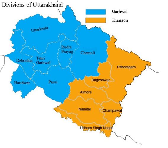 Uttarakhand basically has two divisions ‘Kumaon’ and ‘Garhwal’ and 13 district namely 1. Dehradun 2. Haridwar 3. Chamoli 4. Rudraprayag 5. Tehri Garhwal 6. Uttarkashi 7. Pauri Garhwal 8. Almora 9. Nainital 10. Pithoragarh 11. Udham Singh Nagar 12. Bageshwar 13. Champawat. First seven in Garhwal Divison and rest six in Kumaon Divisions.